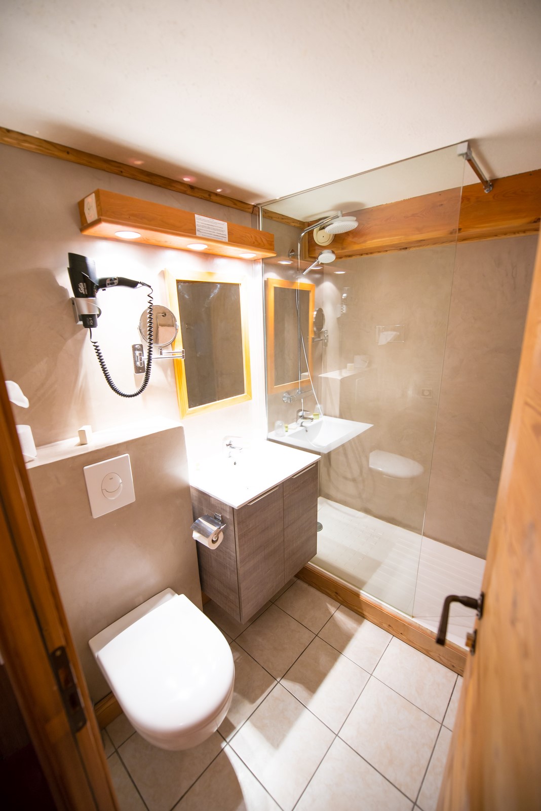 Ces chambres de grand confort, en rez de jardin avec mobilier du Queyras, sont particulièrement adaptées aux personnes soucieuses de leur santé : carrelage au sol, literie spéciale en 160/200, baignoire, et terrasse plein sud. Chambres avec salle de bain et toilettes séparées.