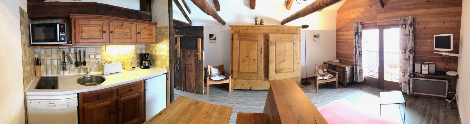 Cuisinette avec lave-vaisselle, plaques halogènes, four multi-fonctions, salle de bain avec douche et sèche cheveux. Télévision.